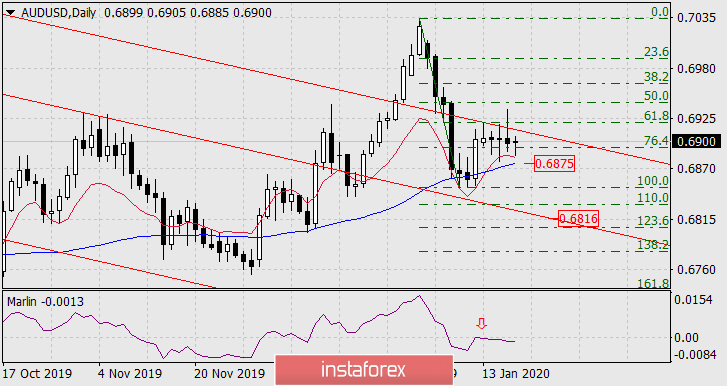 Yesterday, the Australian dollar made a false exit over the resistance of the embedded line of the price channel and the correction level of 38.2% (61.8% on the daily chart), which strengthened the potential for its own fall. With overcoming the support of the MACD line at 0.6875, we are waiting for the price on the line of the price channel at 0.6816, near the Fibonacci level of 123.6%. The Marlin oscillator has shown a qualitative downward reversal from the boundary of the growth territory.