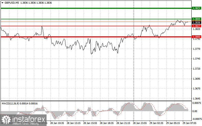 Сценарий №2: покупать фунт сегодня также планирую в случае двух подряд тестов цены 1.3827 в момент, когда индикатор MACD будет находиться в области перепроданности. Это ограничит нисходящий потенциал пары и приведет к обратному развороту рынка вверх. Можно ожидать рост к противоположным уровням 1.3844 и 1.3872.