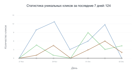 • График уникальных кликов по партнерской ссылке показывает число посетителей, которые впервые перешли по ней с определенного IP-адреса в течение последних 24 часов.