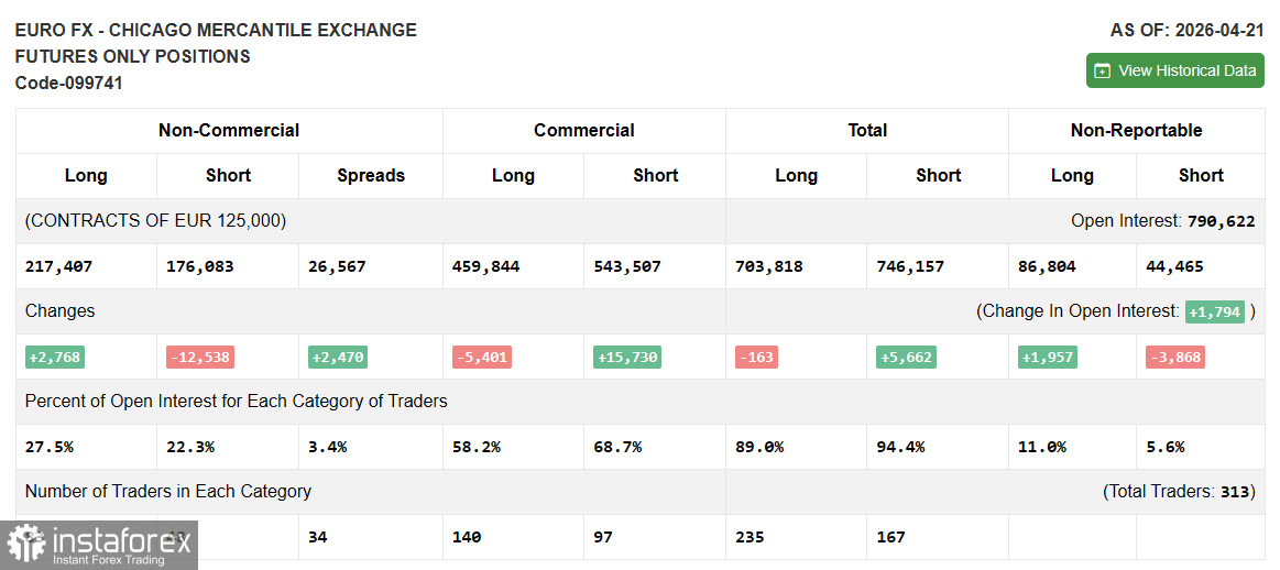 В COT-отчете (Commitment of Traders) за 21 апреля наблюдался рост длинных позиций и сокращение коротких. Очевидно, что продление перемирия между США и Ираном породило спрос на рисковые активы, в том числе и на евро, что привело к росту длинных позиций. Однако ситуация остается довольно напряженной, и любая новая конфронтация может привести к очередному военному противостоянию, так что нужно очень осторожно относиться к подобного рода позитивным изменениям «на бумаге». В COT-отчете указано, что длинные некоммерческие позиции выросли на 2 768 до уровня 217 407, в то время как короткие некоммерческие позиции сократились на 12 083 до уровня 176 083. В результате спрэд между длинными и короткими позициями вырос на 2 470.