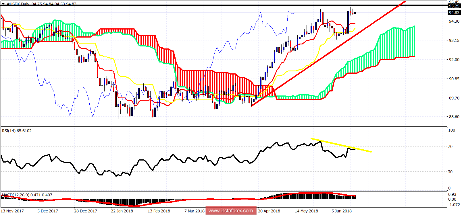 20.06.2018 12:05 AMEl índice del dólar sigue cerca a sus alzas. La tendencia sigue alcista. Hay señales de divergencia bajista que brinda una advertencia para los toros del dólar. El soporte a corto plazo a 94.20-94 es importante para la tendencia a corto plazo. Mientras el precio est por encima de este nivel, podemos ver un movimiento superior hacia 95.70. El siguiente gran movimiento en el índice del dólar ser a la baja.