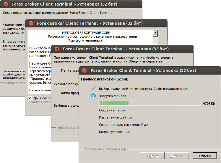 По завершении установки можно приступать к обычному использованию клиентского терминала, запустив его исполняемый файл terminal.exe.