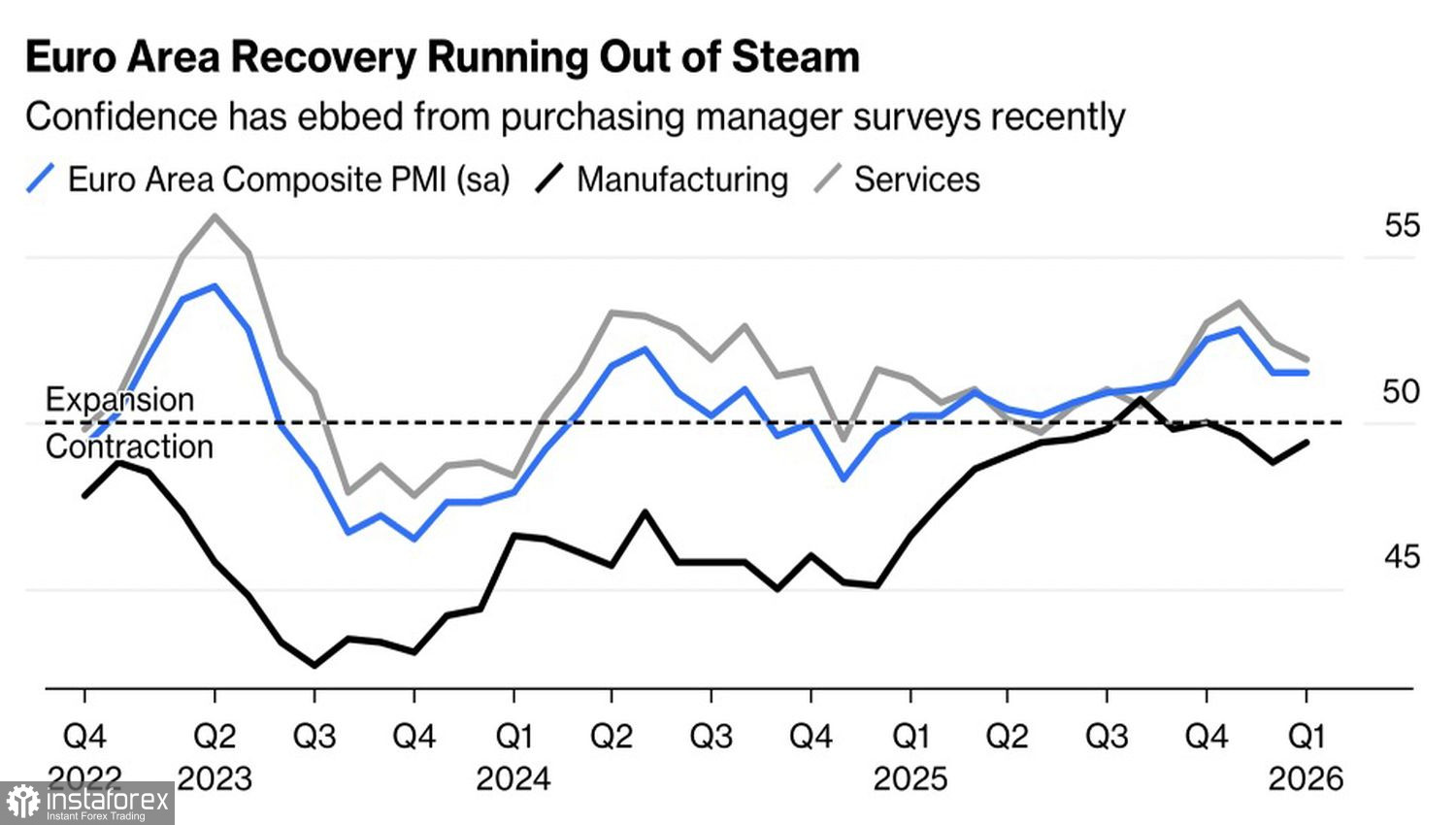 Официально ЕЦБ не имеет цели по курсу евро, однако фактически она у него есть. Когда Германия и Нидерланды борются с Китаем и Японией за звание главного экспортера мира, неплохо бы им помочь. В обратном случае отягощенная тарифами США экономика еврозоны рискует пропустить еще один удар. Судя по динамике деловой активности, она далека от идеального здоровья.