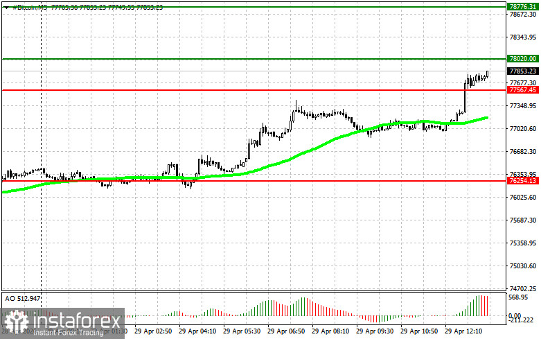 Сценарий №2: покупать биткоин можно от нижней границы $77 500 при отсутствии рыночной реакции на ее пробой в обратную сторону к уровням $78 000 и $78 700.