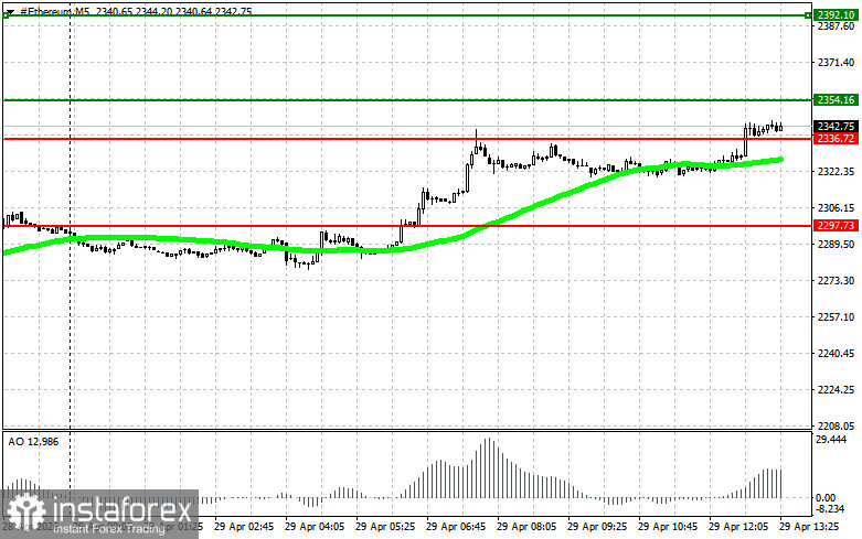 Сценарий №2: покупать эфир можно от нижней границы $2336 при отсутствии рыночной реакции на ее пробой в обратную сторону к уровням $2354 и $2392.